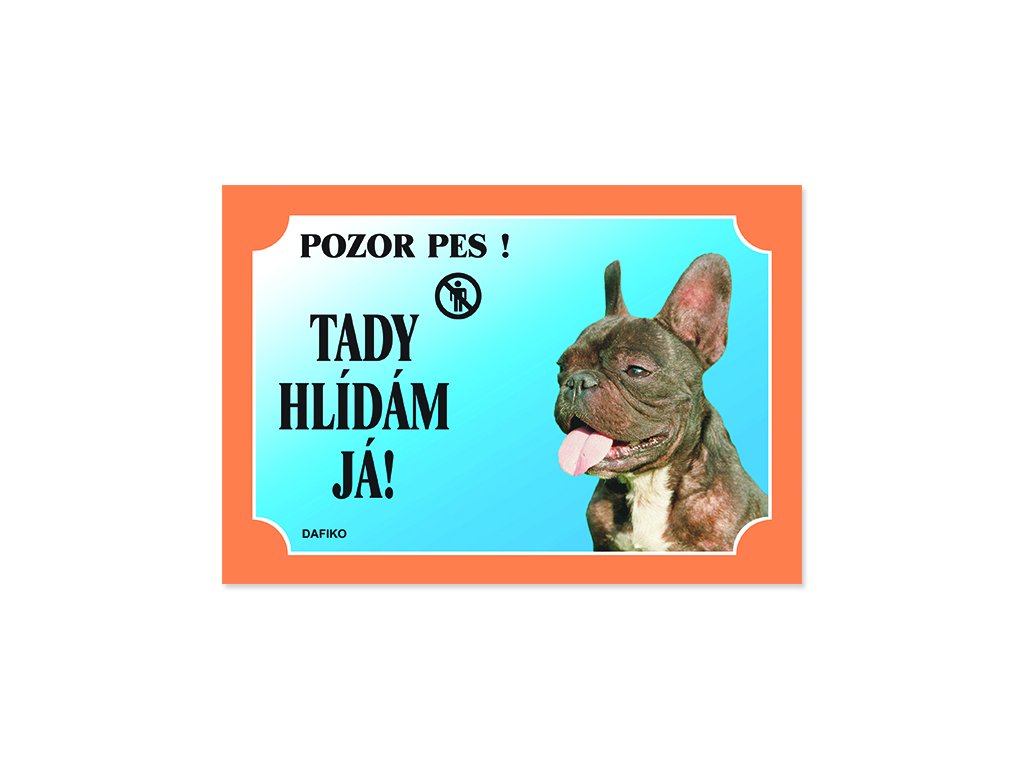 Plastová výstražná tabulka s nápisem: POZOR PES! TADY HLÍDÁM JÁ! a s vyobrazením tmavého francouzského buldoka.