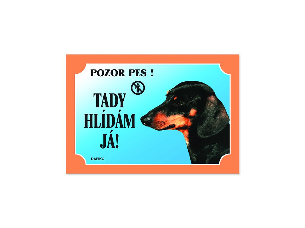 Plastová výstražná tabulka s nápisem: POZOR PES! TADY HLÍDÁM JÁ! a s vyobrazením krátkosrstého černého jezevčíka.