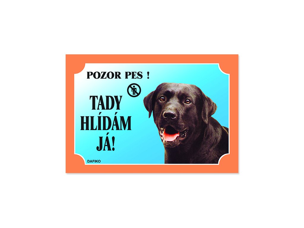 Plastová výstražná tabulka s nápisem: POZOR PES! TADY HLÍDÁM JÁ! a s vyobrazením labradorského retrívra.