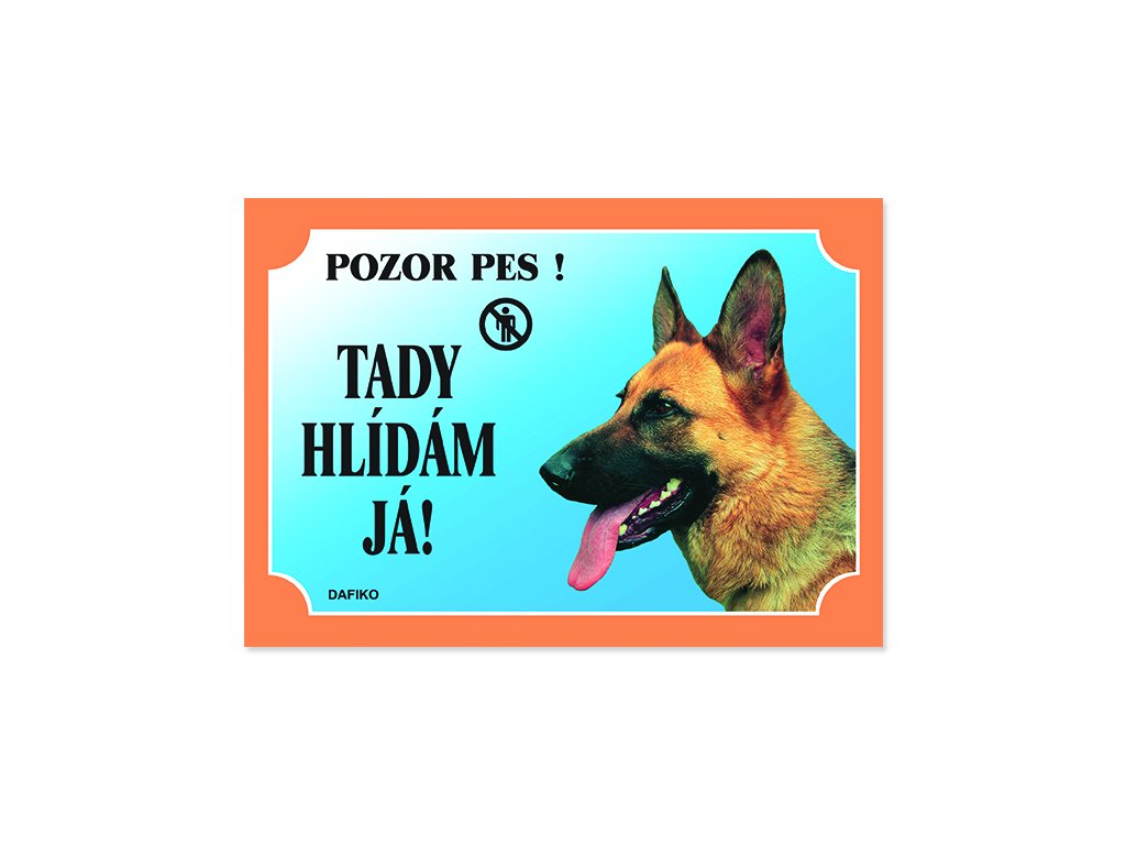 Plastová výstražná tabulka s nápisem: POZOR PES! TADY HLÍDÁM JÁ! a s vyobrazením německého ovčáka.