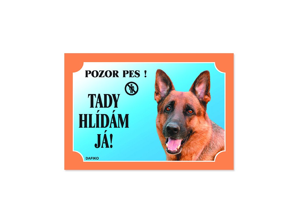Plastová výstražná tabulka s nápisem: POZOR PES! TADY HLÍDÁM JÁ! a s vyobrazením německého ovčáka.