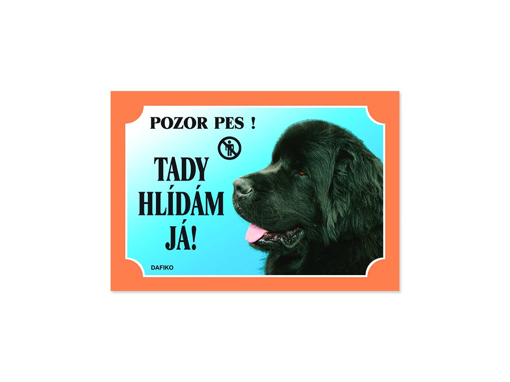 Plastová výstražná tabulka s nápisem: POZOR PES! TADY HLÍDÁM JÁ! a s vyobrazením novofundlanským černým psem.