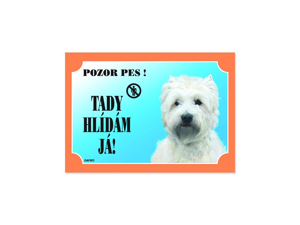 Plastová výstražná tabulka s nápisem: POZOR PES! TADY HLÍDÁM JÁ! a s vyobrazením west highland white terriera.