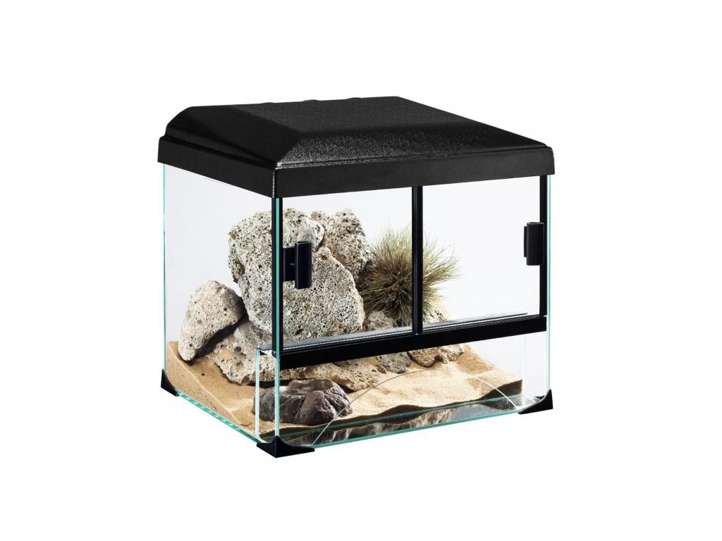 Terraset Desert 60x40x45 je kompletní sada pro milovníky terárií, která obsahuje: terárium s posuvnými dveřmi, moderní plastový kryt, kámen, teploměr a misku na vodu a krmivo . Sada je doplněna o drobnosti od Tropical.