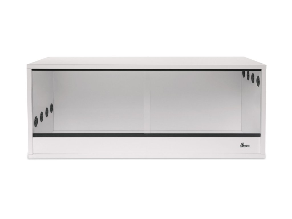 Terárium z bílých nábytkových desek. Terárium pro vlastní montáž, vybavené gravitačním větráním nahoru a dolů a dvojicí posuvných skleněných dvířek.