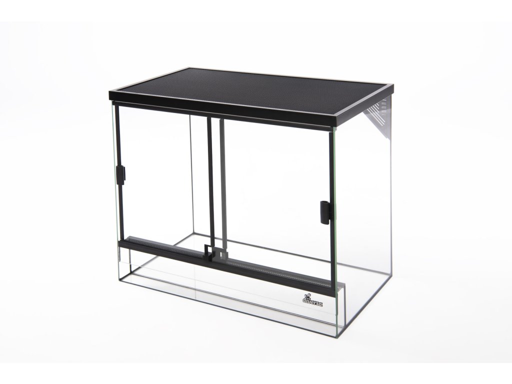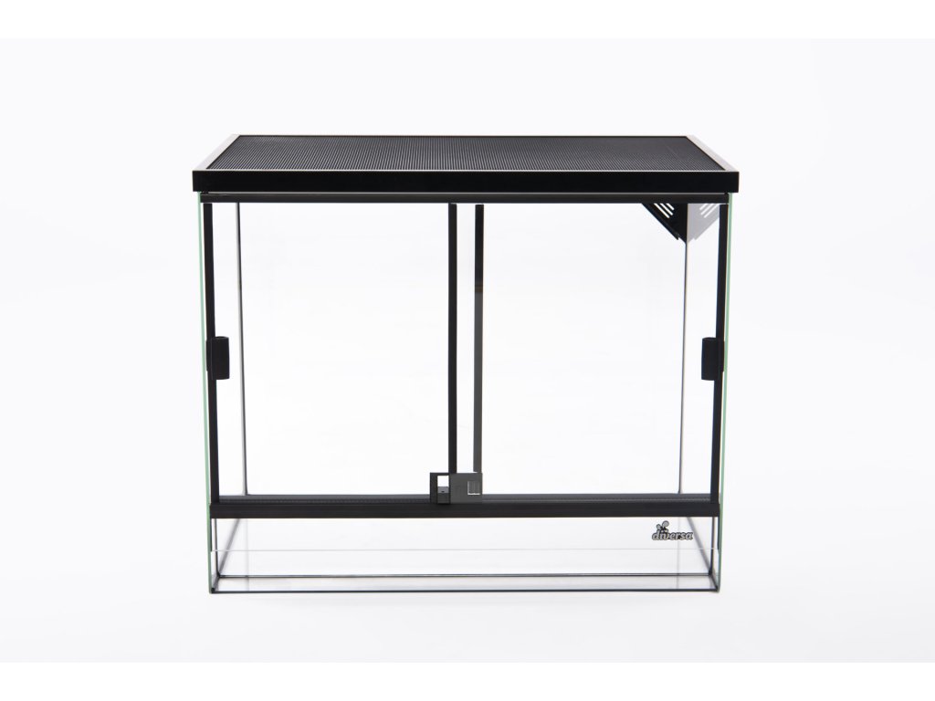 Skleněné terárium s posuvnými dvířky, navíc vybavené zámkem a horním větráním v podobě hliníkového rámu se síťkou integrovanou do nádrže. Terárium má také spodní větrání, úchyty dvířek a průchodku na kabel. Díky použití černých detailů a černého silikonu působí terárium velmi esteticky a elegantně.