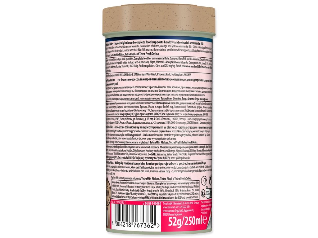 Kompletní krmivo pro akivarijní ryby. Zlepšení intenzity zbarvení lze pozorovat už po dvoutýdenní aplikaci krmiva. Obsahuje stabilní množství vitamínu C. Krmný návod: krmte několikrát denně malé množství. Složení: ryby a výrobky z ryb, obiloviny, sušené krmné kvasnice, měkkýši a korýši, rostlinné bílkovinné extrakty, oleje a tuky, řasy, cukry (0,9% oligofruktóza), minerální látky. Jakostní znaky: hrubé proteiny 46%, vlhkost 6%, hrubé oleje a tuky 11, hrubá vláknina 2%, vitamín A 40820 m.j./ kg, vitamín D3 2320 m.j./ kg, mangan 78 mg / kg, zinek 46 mg / kg, železo 30 mg / kg.