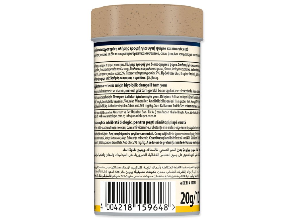 Kompletní krmivo pro okrasné akvarijní ryby. Obsahuje 40 pečlivě vybraných, vysoce kvalitních surovin, zahrnujících veškeré významné živiny pro život, vitamíny a stopové prvky. Posiluje obranné mechanismy jejich organismu, kladně ovlivňuje stavbu kostry a napomáhá růstu. Obsahuje stabilní množství vitamínu C. Krmný návod: krmte několikrát denně tolik, kolik ryby spotřebují během několika minut. Složení: ryby a vedlejší výrobky z ryb, obiloviny, sušené krmné kvasnice, vedlejší výrobky rostlinného původu, měkkýši a korýši, oleje a tuky, řasy, cukr, lecitin. Jakostní znaky: hrubé proteiny 46%, vlhkost 6%, hrubé oleje a tuky 8%, hrubé popeloviny 11%, hrubá vláknina 2%, vitamín A 37600 m.j./ kg, vitamín D3 2000 m.j./ kg, vitamín E (alfatokoferol) 125 mg / kg, vitamín B1 45 mg / kg, vitamín B2 125 mg / kg, vitamín B6 25 mg / kg, vitamín B12 0,1 mg / kg, L-askorbyl-2-polyfosforečnan (stabilizovaný vitamín C) 515 mg / kg, pantothenan vápenatý 125 mg / kg.