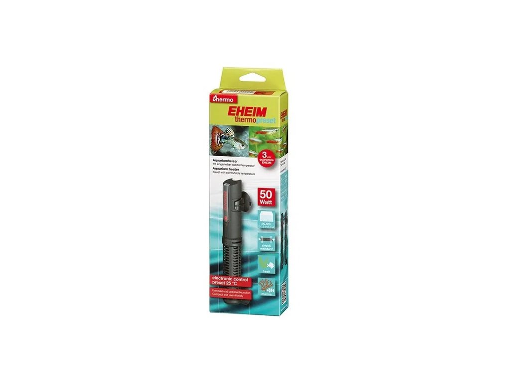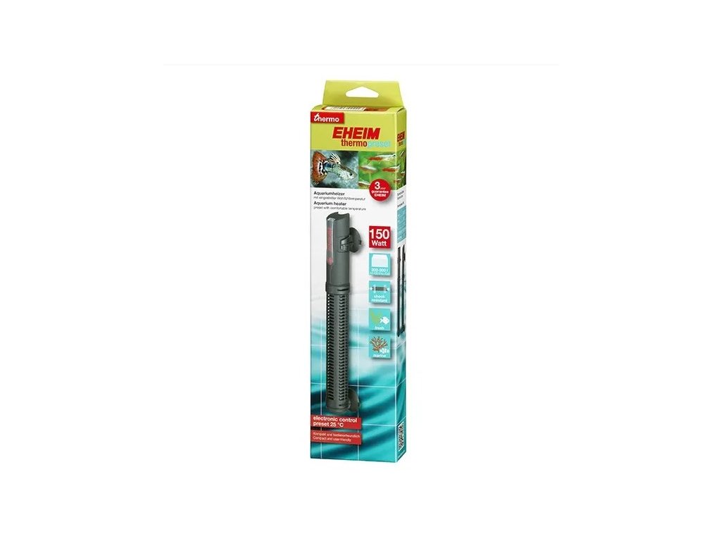 Jednodušší už to být nemůže: s EHEIM Thermopreset je přednastavena příjemná teplota pro obyvatele akvária. Vaše akvárium si udrží konstantní teplotu 25 stupňů Celsia. To je také optimální teplota pro chov nejběžnějších obyvatel akvária. Elektronická regulace zaručuje mimořádně vysokou přesnost / správnost teploty, vysoce účinné topné těleso zajišťuje rovnoměrné rozložení tepla.
