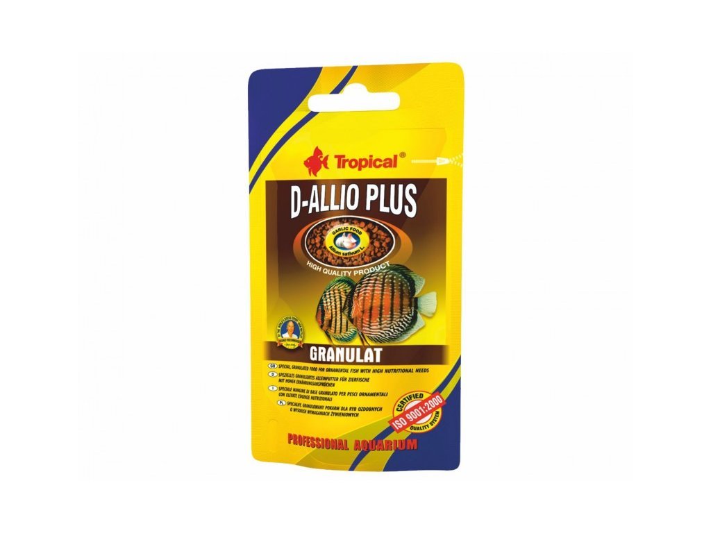 V přípravku D-Allio Plus Granulat jsou využity odedávna známe a ceněné vlastnosti česneku (Allium sativum L.). Tento přírodní přídavek posiluje rybí organismus a podporuje trávící proces. Vysoká výživná hodnota krmiva, optimálně zvolené spektrum vitamínů a mikročástic a přirozené vlastnosti česneku způsobují, že toto krmivo hraje nezastupitelnou úlohu při léčbě a rekonvalescenci ryb a při jejich aklimatizaci v nových podmínkách. Toto krmivo je k dispozici i v jiné formě: D-Allio Plus Flakes.