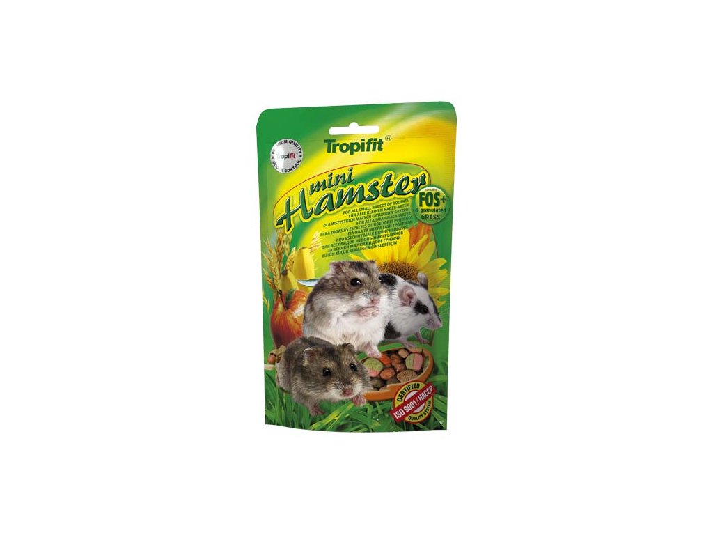 MINI HAMSTER je kompletní krmivo pro malé druhy křečků (např. Campbellův trpasličí křeček, čínský křeček, Dzungarský křeček, Roborowski křeček) a jiné malé hlodavce (např. myši jako zebramyš, egyptská ježčí myš, africká trpasličí myš nebo pouštní běžec). Krmivo obsahuje granule s přídavkem jablek, černého rybízu a alfalfa, bohatého na bílkoviny.
