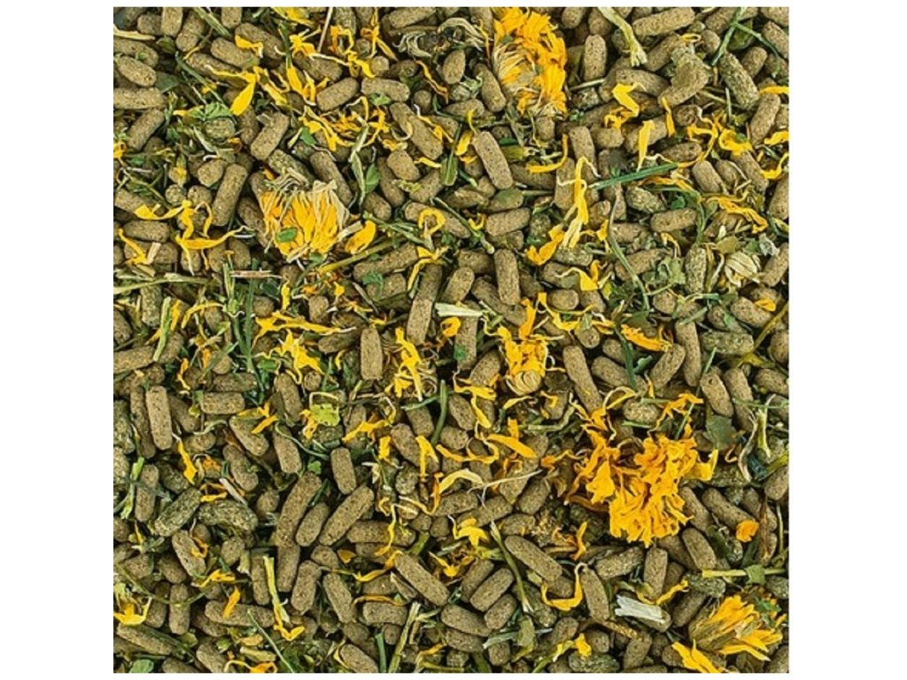 Složení: vedlejší produkty rostlinného původu (granulát s travinami, granulát s vojtěškou, granulát s ovocem, květy měsíčku lékařského 2%, listy ostružin 1%, listy pampelišky 1%), obiloviny, zelenina (v tom petrželová nať 6%), oleje a tuky, minerální látky.