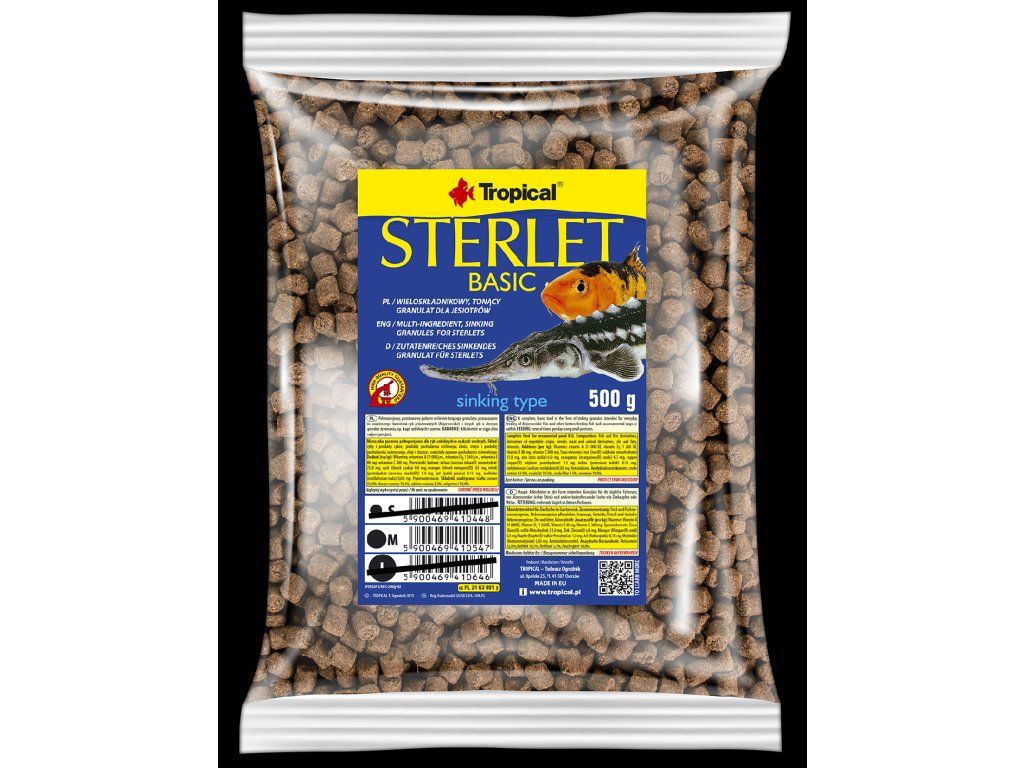 Sterlet Basic velikosti M je vícesložkové potápivé krmivo ve formě granulí určené pro každodenní krmení jeseterů a dalších ryb, které přijímají potravu u dna (např. koi kapři). Díky potápivé formě se krmivo dostane tam, kde ho jeseteři přirozeně sbírají – ke dnu jezírka.