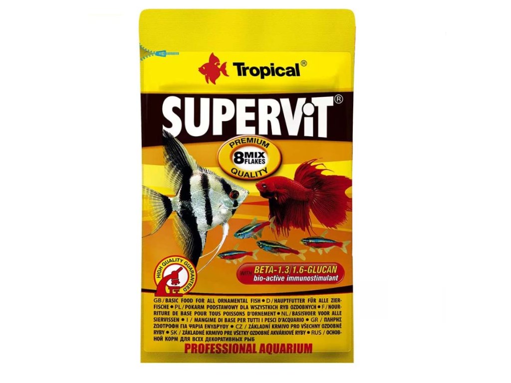 Obsahuje osm různých druhů vloček, obsahujících mimo jiné: imunostimulátor beta-glukan, astaxanthin, řasu kelp, spirulin, korýše včetně chutného krila. Několik desítek nejkvalitnějších vybraných složek, které doplňuje optimálně sestavené spektrum vitamínů a mikročástic, zajišťuje potřebné živiny a energií i pro ty nejvíce vybíravé druhy ryb. Neobvyklé bohaté složení krmiva Supervit způsobuje, že se používá především v populárních mnohodruhových akváriích, kde je základem potravy, která se pouze v případě potřeby doplňuje rostlinnými krmivy a krmivy s vysokým obsahem bílkovin. Toto krmivo je k dispozici i v jiné formě: Supervit Granulat, Supervit Mini Granulat, Supervit Chips, Supervit Tablets A, Supervit Tablets B