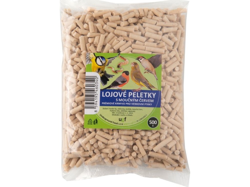 Lojové peletky s moučným červem jsou prémiové krmivo pro venkovní ptáky. Obsahují kvalitní hovězí lůj, obiloviny, arašídy a moučné červy. Pro ptáky jsou velmi atraktivní a přilákají do zahrady různé druhy divokých ptáků. Mohou se podávat samostatně v krmítcích nebo na zemi. Skvěle také doplňují různé semínkové směsi.