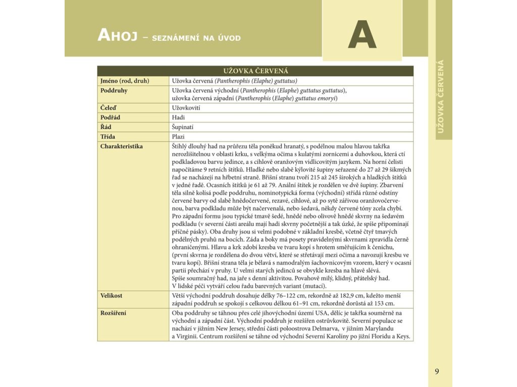 Tato knížka je celá věnovaná pouze jednomu druhu. Naleznete zde všechny informace o užovce červené - mezi teraristy velice oblíbeném a rozšířeném hadovi. Mnoho chovatelů, kteří se rozhodli chovat hady, tak začínali právě s touto krásnou a relativně nenáročnou užovkou. Kniha je přehledně rozdělena do kapitol, je zde věnována pozornost základní péči, rozmnožování, chovu mláďat, možným komplikacím v chovu, vztahu k člověku, biologii druhu atd... Své si zde najdou začátečníci i zkušení chovatelé.