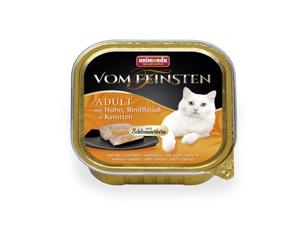 Vysoce kvalitní paštika Von Feinsten CORE s kuřecím a hovězím masem a mrkví pro dospělé kočky všech plemen.