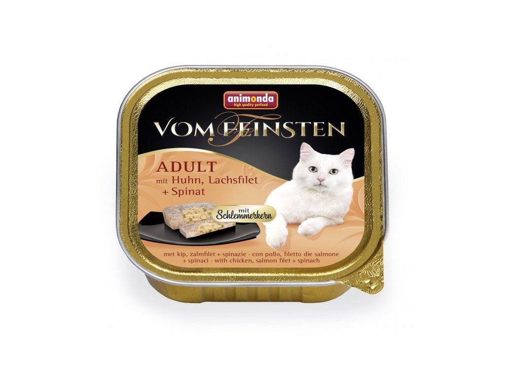 Vysoce kvalitní paštika Von Feinsten CORE s kuřecím masem, filetem z lososa a špenátem pro dospělé kočky všech pleme.