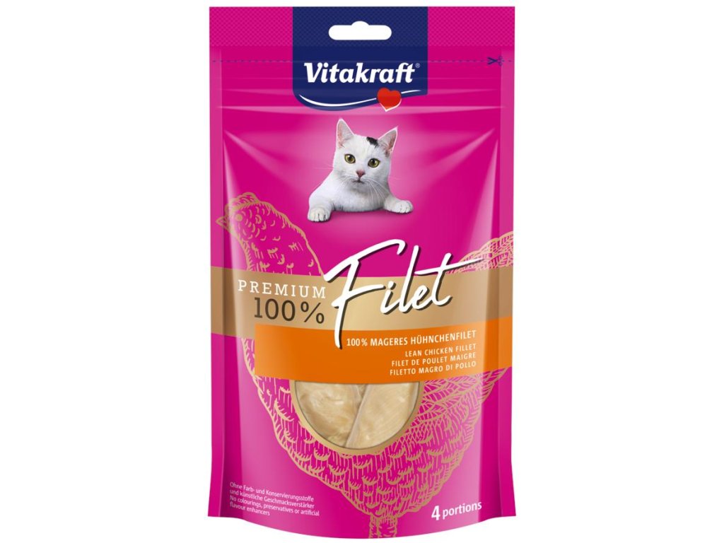 Chuťový požitek plný masa - Vaše kočka si tento snack zamiluje! 100% čisté nízkotučné kuřecí filety, zcela bez obilovin, barviv a umělých ochucovadel budou hýčkat chuťové buňky Vašeho mazlíčka, a to zdravou, přírodní cestou. Filety jsou připravovány procesem šetrného vaření a jsou tak nádherně šťavnaté a jemné. Snacky Vitakraft Premium Filets neobsahují obilniny a jako zdroj bílkovin slouží pouze kuřecí maso, jsou tudíž vhodné i pro nutričně citlivé jedince! Snacky jsou baleny jednotlivě pro zachování čerstvosti, vůně a chuti. Voňavý snack, kterému žádný kočičí jazýček neodolá! Vitakraft Premium Filet v krátkém přehledu: Snack pro kočky - jako malá svačinka nebo chutná odměna 100% kuřecí filety Bez obilovin, hypoalergenní: ideální pro nutričně citlivé kočky Šetrně vařené: filety zůstanou šťavnaté a jemné Bez umělých ochucovadel a barviv Praktické a jednotlivě balené pro ochranu vůně a chuti