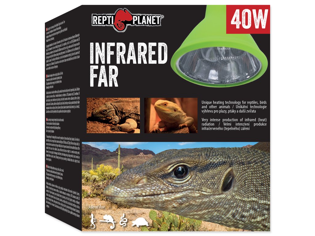 Unikátní technologie výhřevu pro plazy, ptáky a další zvířata. Velmi intenzivní produkce infračerveného (tepelného) záření. Nižší spotřeba elektrické energie při větší efektivitě výhřevu. Neprodukuje světelné záření. Unikátní konstrukce výhřevného reflektoru zajišťuje produkci intenzivního infračerveného (tepelného) záření. Reflektor je chráněn krycí kovovou mřížkou. Je vhodné kombinovat se světelnými a UVB žárovkami nebo LED osvětlením. Při výběru žárovky je nutné zohlednit nejen typ žárovky, ale také druh chovaného zvířete a vzdálenost zvířete od zdroje tepelného záření. Na žárovky a zářivky se vztahuje běžná záruční doba. Nevztahuje se však na prasknutí tepelných vláken nebo prasknutí trubice a unik plynu, které je způsobeno běžným užíváním (standartní doba životnosti je cca 6 měsíců). Záruční doba se může lišit dle jednotlivých států a podléhá místním zákonům a předpisům.