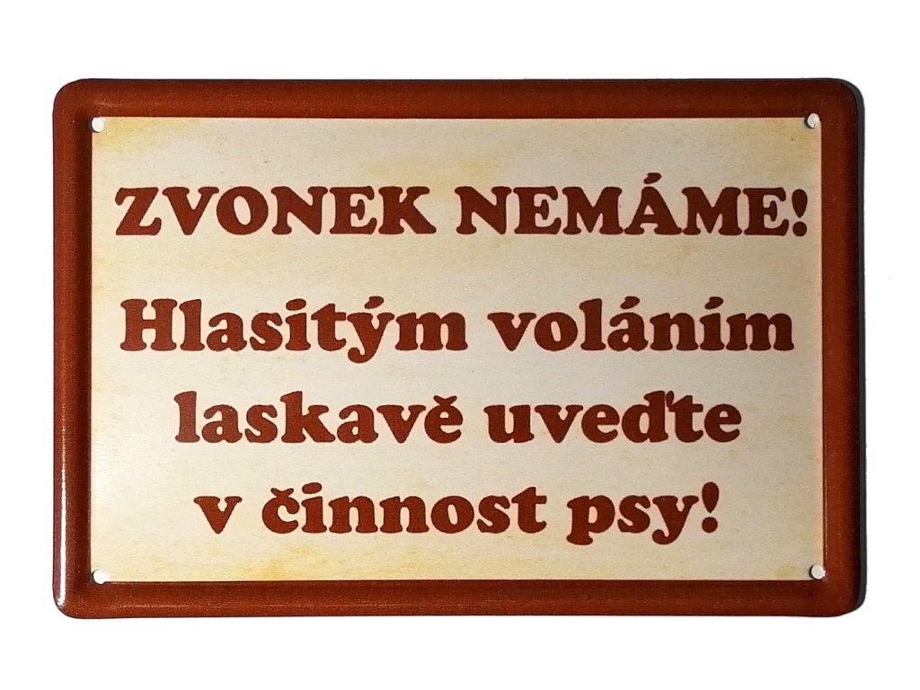 Plechová psí cedulka pro venkovní i vnitřní použití v rozměru 150x100mm, v rozích 4 díry pro uchycení, prolisovaný zdobný okraj tabulky, potištěný plech.
